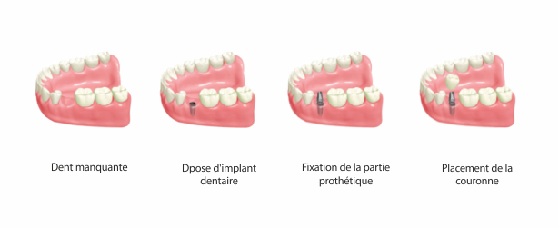 Les implants soutiendront la formation de votre nouvelle prothèse ou dents en les place dans l'os. Les implants dentaires peuvent être considérés comme la meilleure prothèse radiculaire intra-osseuse pour fournir un support solide aux dents prothétiques. Ils agissent en protégeant l'os et les tissus mous pour vous offrir un confort et une apparence agréable.
