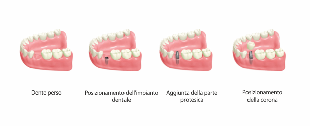 Se c'è un dente mancante, il miglior materiale per sostituire il dente è l'impianto. L'applicazione degli impianti fatti di materiali biocompatibili avviene inserendoli nella mascella.